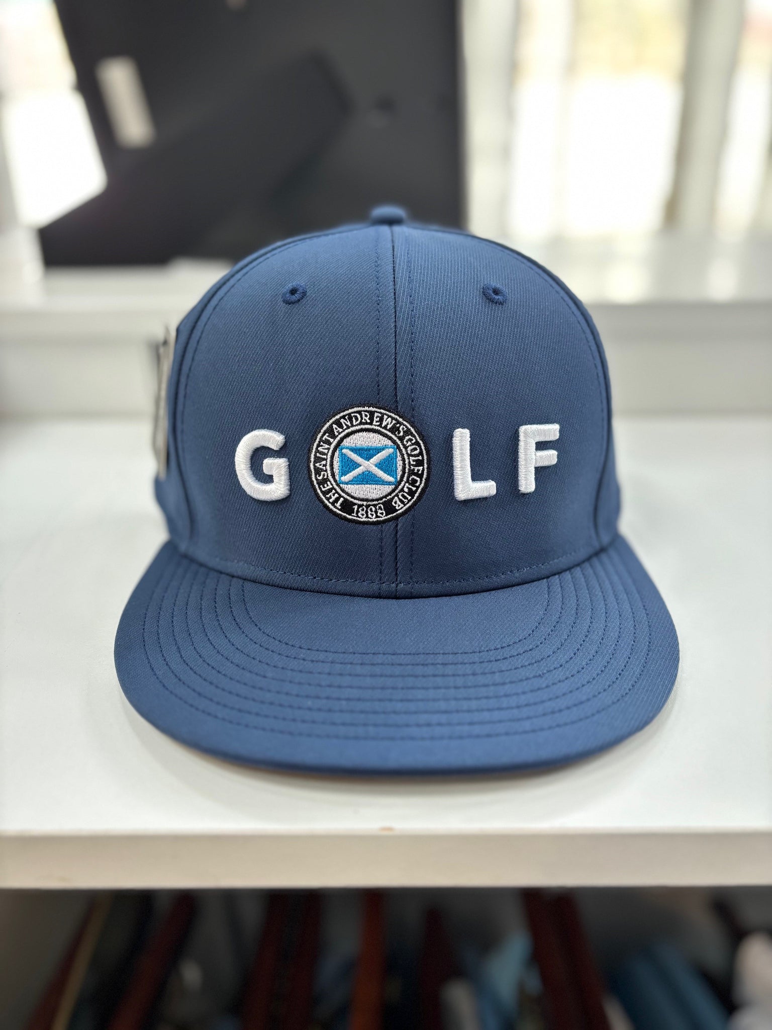 The Golf Logo Hat cleverly incorporates the Saint Andrew's logo into the spelling of "Golf." This classic structured design features an adjustable fit and is a staple in any wardrobe.